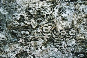在銀庫東面的墻面上,刻著道道曲線、直線、粗線、細(xì)線,交錯(cuò)縱橫,初看極像一幅巨大的軍事地圖。盡管歷經(jīng)風(fēng)雨滄桑,高6米,長10米的圖案中有些地方已風(fēng)化剝落,但仔細(xì)琢磨,人們又可以發(fā)現(xiàn)那一道道走勢(shì)神秘的線條和大小不一的圈圈點(diǎn)點(diǎn)似乎蘊(yùn)含著某種規(guī)律。它們有的在暗示流經(jīng)始興的湞江與墨江沿途的流向,有的則在影射寶塔山偉岸之軀的方位。