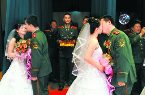 這場(chǎng)婚禮,是為21名因參加奧運(yùn)安保而數(shù)度推遲婚期的武警戰(zhàn)士而辦,21名新郎中,還包括兩名著名的中國(guó)武警雪豹突擊隊(duì)隊(duì)員。劉強(qiáng)是雪豹突擊隊(duì)的一員,奧運(yùn)期間,他每天穿著30多斤重的作戰(zhàn)服執(zhí)勤。這位今天看上去帥氣十足的小伙子,昨天還被參謀長(zhǎng)“勒令”抽出時(shí)間去理發(fā)。“我本來(lái)打算在2月份結(jié)婚,結(jié)果為了奧運(yùn)安保,隊(duì)里任務(wù)比較重,結(jié)婚的事只好暫時(shí)擱置下來(lái)。”劉強(qiáng)告訴記者,老家同齡人的孩子都上小學(xué)了,為此家里沒少催促他。劉強(qiáng)的新娘住在豐臺(tái)區(qū),新娘子顯得溫柔體貼,臉上洋溢著幸福感,對(duì)于婚期推遲到今天,她表示毫無(wú)怨言,還笑呵呵地說(shuō):“軍功章有他的一半,也有我的一半!。