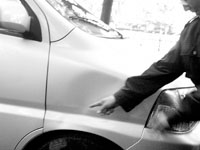 昨日15時(shí)40分,記者來到位于正義路市公安局對(duì)面的輔路上,只見一名30來歲的青年男子倚在警車旁邊,大半個(gè)身子倒在地上意識(shí)迷湖,民警正在一旁詢問情況。警車的身后停著三輛有城管標(biāo)志的車,其中一輛金杯車的前蓋右側(cè)處有一個(gè)坑,表層的鐵皮明顯凹陷 (見圖),車身上寫著“崇文綜合執(zhí)法”,還有一輛車的車斗上有一輛舊三輪車,城管工作人員稱,該三輪車是被暫扣的非法無照運(yùn)營車輛。