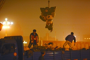昨晚8時,大批工人進(jìn)入天安門廣場,開始撤換花壇。