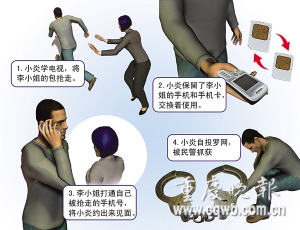 一男孩搶走一女孩手機,還將搶來的手機卡和自己的換來換去地用。被搶女孩打通自己的電話,自稱朋友約搶匪見面,搶匪信以為真,結(jié)果自投羅網(wǎng)。