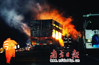 事故發(fā)生后,油罐車上的兩名男子迅速逃生,但大貨車上的人直到大火熄滅也沒有走出來。事故造成京珠高速雙向塞車數(shù)十公里,高速公路封閉6小時。目前,清遠高速交警大隊拒絕向記者透露具體死亡人數(shù)。