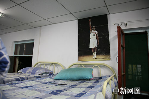一位男同學(xué)床頭貼著籃球明星的海報(bào)