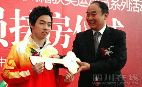 昨天上午的成都溫江金強大學城廣場前熱鬧非凡,四川省體育局在此表彰北京奧運會上奪牌的川籍運動員。鄒凱、呂遠洋、陳朝霞、張益萌、蔣婷婷、蔣文文和王娜等在北京奧運會上為四川爭光添彩的運動員接受了由某房地產(chǎn)商贈送的住房。其中,獨攬三金的“體操王子”鄒凱開心地接過了一套近200平方米躍層住房的鑰匙,而帆板金牌得主殷劍則獲得一套三居室住房,此外,獲得北京奧運會銀牌和銅牌的四川選手也分別獲得套二和套一的住房。