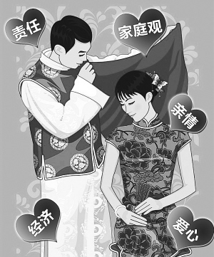 “結(jié)婚生子、白頭偕老的婚姻觀依然占主導(dǎo)地位。”徐安琪說,65.6%的人贊同“不管怎么說,人總是要結(jié)婚的”,反對的為15.2%;72%的受訪者贊成“婚姻是神圣的,結(jié)了婚就要白頭到老”,不贊同的僅為6.7%。此外,84.4%的人反對“結(jié)婚后不要孩子”,對“丁克”家庭持肯定態(tài)度的僅占1.6%。