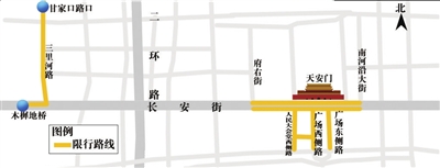 限行路段:長安街府右街南口至南河沿南口雙向,人民大會堂西側(cè)路和天安門廣場東側(cè)路,禁止非機(jī)動車和行人通行,公交車甩站通過,地鐵天安門東站、西站甩站通過。