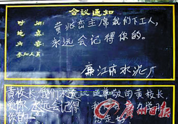 廉江一中的學(xué)生在黑板上留言紀(jì)念黃兆巒。戚照攝