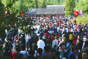 昨日,香山公園東門外擠滿了等候進園的游客。當日,香山游客達到8萬人。