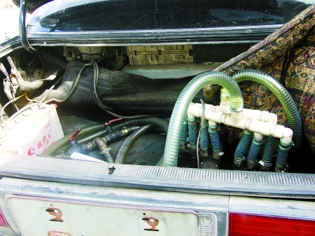 “為了避人耳目,大鐵箱被用布蓋著。鐵箱上連著直徑有5厘米粗、內有鐵絲的硬質塑料管,五六米長的管子上安裝有閥門、連接有油泵、進出油過濾油器、開關等。原來轎車就是用這根‘長鼻子’把大貨車的油偷走了!崩罹该髡f。