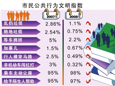 昨天,首都文明辦委托中國人民大學(xué)人文奧運研究中心發(fā)布的2008年北京奧運會期間“市民公共行為文明指數(shù)”顯示,今年文明指數(shù)大幅提升,與2005年相比提高17.17個分值。其中,隨地吐痰率下降到0.75%,98%的市民乘車主動讓座。