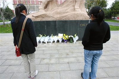 學生在擺放鮮花的雕塑前緬懷身亡的教授。本報記者張沫攝
