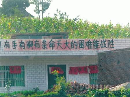 石光武是兩條標(biāo)語的原創(chuàng)者之一,另一位原創(chuàng)者是棗樹村村委會主任雍明。“地震后,大家碰面都會說幾句鼓勵打氣的話,我就想選幾句寫成標(biāo)語,鼓勵大家不等不靠,自己動手重建家園!笔馕涞脑捄土硪痪浔淮迕窠(jīng)常掛在嘴邊的話被雍明選中。7月下旬,“出自己的力,流自己的汗,自己的事情自己干”、“有手有腳有條命,天大的困難能戰(zhàn)勝”兩條標(biāo)語分別貼在村民尚元進和村民李玉明家墻上。