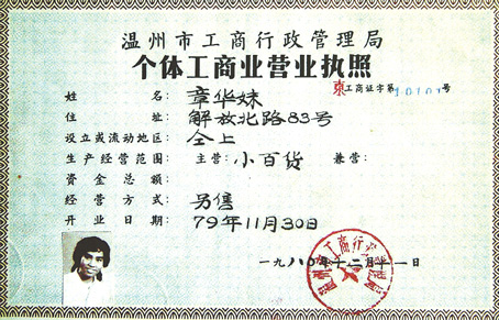 1980年12月11日,章華妹———一個19歲的溫州姑娘,從溫州市工商局鼓樓工商所領(lǐng)到了一張用毛筆填寫的還附有她本人相片的“個體工商戶營業(yè)執(zhí)照”。讓章華妹沒有想到的是,她領(lǐng)到的這張編號為10101的證書,是中國第一張“個體工商戶營業(yè)執(zhí)照”。