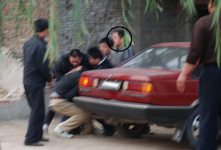 為進(jìn)一步證實搓麻者的身份,記者在鎮(zhèn)政府附近求證時,遭遇不明身份人員搶奪攝影器材。為保護(hù)好攝影器材,三名記者遭圍攻。本報司機(jī)用車內(nèi)另一臺相機(jī)拍下?lián)寠Z現(xiàn)場,不明身份者又來搶奪他的相機(jī),并將其右胸刺傷。