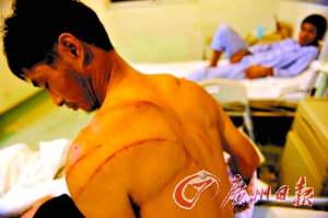 肖貴保是受傷的8人當(dāng)中傷勢(shì)最重的一個(gè),其主治醫(yī)生介紹,他面部正中一刀,刀痕從右眼正中間一直延伸到上嘴唇,后腰也被砍了一道長12厘米左右的傷口。