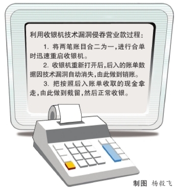 發(fā)現(xiàn)這個“秘密”后,楊某打起了歪主意。“當(dāng)天打烊時,我合了兩份單并重啟了收銀機,利用技術(shù)漏洞銷掉其中一筆100元的賬,將已收的100元現(xiàn)金拿走。擔(dān)心了一夜,結(jié)果第二天風(fēng)平浪靜!