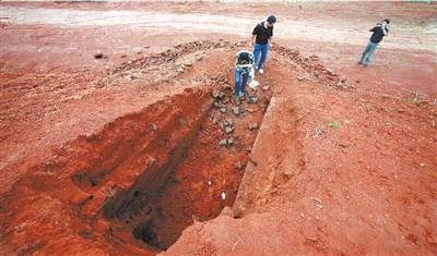 從山坡上可以看到出土漢代耳珰的平臺已經(jīng)被挖空了一大塊。據(jù)唐濤介紹:“6月初他們剛剛開工不久,我們(郴州市文物管理處)6月4日就在這塊被挖空的平臺發(fā)現(xiàn)了一座漢代磚室墓,當(dāng)時下達(dá)了‘停工通知書’,告知建設(shè)方,需經(jīng)我們對墓葬發(fā)掘后才能再動工!钡且患埼臅缡链蠛,郴州市文物管理處沒有接到建設(shè)方的任何回復(fù)。