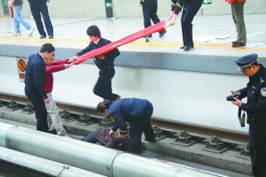 目擊者劉女士稱,墜軌事件發(fā)生在9時30分許,她當時正在該站等地鐵,突然聽見刺耳的剎車聲,列車在進站口就停下了,一個人臥倒在車前,地鐵員工等聞聲急忙前來救人。