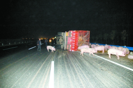 貨車司機張博受了點皮外傷,他走出駕駛室后看到路上已經(jīng)血流成河,活豬尖叫著亂竄,趕緊打電話報警。此時已是凌晨1時50分,正在值班的省公安廳高速交警支隊柳林大隊副大隊長王哲趕緊帶人趕往現(xiàn)場。他看到一輛紅色的雙層貨車側(cè)翻在行車道和應(yīng)急車道上,紅色的血從貨車的籠子里向外流,散發(fā)出腥味,沒有死的豬還低沉地哼著。過往的車輛走到此處也急剎車,避讓在路上撒歡兒的活豬。