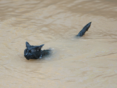這只全身毛發(fā)黑亮黑亮的貓目前雖然沒有名字,但在長江冬泳俱樂部200多名隊員中算是個明星了,盛名全仰仗它會游泳,這在天性怕水的貓科動物中絕對算是一個異類。俱樂部成員桑長江介紹,黑貓是5月中旬出生的,才半歲,可它的泳齡都有4個月了。7月中旬,一個隊員下午在下長江游泳時,不小心將這只在船邊玩耍的黑貓?zhí)叩浇锪耍蠹叶贾镭埡芎ε滤,以為黑貓會很快被淹死,可它在湍急的江水里使勁撲騰,游到船邊被救了起來,這讓在場的十幾個隊員都感到十分驚訝。而且從黑貓在水里撲騰的姿勢看大家一致認為,它是一個可以訓練出來的游泳好手。