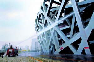 記者上午在現(xiàn)場看到,共有兩輛消防車已經(jīng)在鳥巢的西北側(cè)開始了清洗工作,高壓水槍將清水直接噴射到鳥巢縱橫交錯(cuò)的鋼結(jié)構(gòu)外立面上,很多原本看上去落滿灰塵的地方都在清水的噴刷下瞬間恢復(fù)了鋼結(jié)構(gòu)原有的顏色和光澤。業(yè)主單位相關(guān)負(fù)責(zé)人介紹,由于鳥巢是獨(dú)特的鋼膜結(jié)構(gòu),用清水清洗主要是為了保護(hù)這些特殊的鋼結(jié)構(gòu)和膜結(jié)構(gòu)。