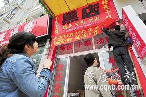 “取這樣的名字就是為了吸引眼球,其他沒(méi)啥特別的意義!辈宛^老板楊宗寶稱。今年25歲的楊宗寶是合川區(qū)人,以前打工為生,最近才和好友合伙開(kāi)此湯鍋店。“為了取個(gè)特別的名字,我們想了四五天!睏钭趯毞Q,他經(jīng)常玩網(wǎng)絡(luò)游戲“魔獸爭(zhēng)霸”,游戲里把特別厲害的戰(zhàn)隊(duì)稱為“黑店”,左思右想后,他決定把“黑店”復(fù)制到自己的餐館身上!斑@不,餐館明天才開(kāi)業(yè),不過(guò)招牌掛出來(lái)就吸引了不少人氣!彼靡獾卣f(shuō),沒(méi)聽(tīng)有人說(shuō)啥不好的。