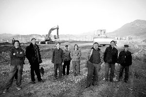 昨日下午,40余名松樹峪村村民守在村東口的修路工地里,阻止推土機掘土施工,數(shù)輛施工機器停在工地由工人看守。被推平的土地寬20余米,兩側的莊稼地里還留著連片的秸稈。