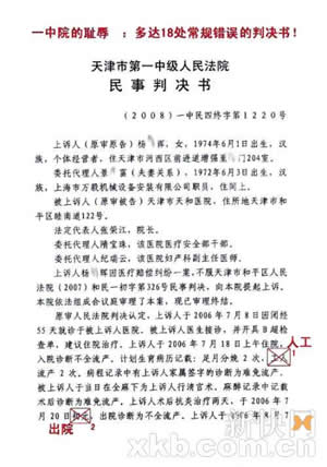 一篇名為《天津某法院多達(dá)18處低級錯(cuò)誤的終審判決書》出現(xiàn)在某論壇上。一位網(wǎng)名是“哭泣不是懦弱”的發(fā)帖人在帖子中寫道:“這是我2008年11月7日領(lǐng)到的法院終審判決書。一份僅6頁的判決書,光錯(cuò)別字、丟字等低級錯(cuò)誤就有18處。這樣一份錯(cuò)誤百出的終審民事判決書還赫然蓋上了"××法院"的公章。難道法官就是這樣的工作態(tài)度嗎?法律的權(quán)威與神圣蕩然無存!”