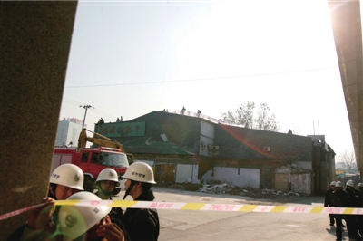 昨天上午8點(diǎn)多,100多名男子列隊(duì)將位于豐臺(tái)路口的“福成肥!憋埖昃o緊包圍。這些人均著統(tǒng)一服裝,部分人頭戴標(biāo)有“城市管理”字樣的白色頭盔,身著深藍(lán)色大衣;部分人全身迷彩服。3輛鏟車和消防車也開(kāi)到飯店門(mén)前。拆遷者還用警戒線將飯店圍住。
