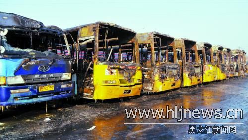 21日清晨,在哈市香坊區(qū)薛家屯208路公交車(chē)終點(diǎn)站停車(chē)場(chǎng)內(nèi),一輛雙燃料公交車(chē)點(diǎn)火啟動(dòng)時(shí),由于工人違章操作致化油器回火并引發(fā)火災(zāi),停放在該車(chē)兩側(cè)的8輛公交車(chē)和1輛貨車(chē)被殃及。