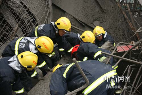 據(jù)了解,鄞州消防大隊接到報警,迅速出動3輛消防車18名消防戰(zhàn)士到達(dá)現(xiàn)場,發(fā)現(xiàn)六七名施工人員已經(jīng)倒在鋼筋水泥中,但幸好不是埋的很深,于是消防戰(zhàn)士就用救援器械將困住受傷者的斷裂鐵架等雜物一一清理掉。