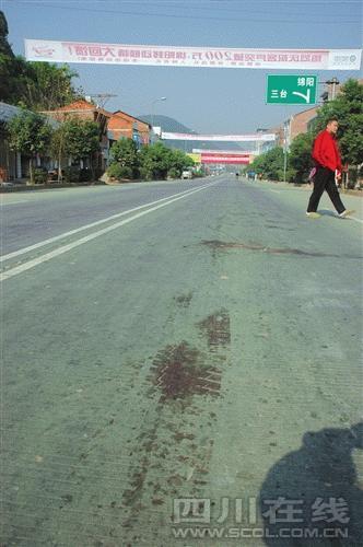 出事地點位于鹽亭縣兩河場鎮(zhèn)中部一個路口,是小鎮(zhèn)相對熱鬧的地段,周圍店鋪也較為集中。盡管過去了10多個小時,路面上一攤凝固的血跡和往來車輛碾壓血跡形成的暗紅色輪胎印跡仍清晰可見。