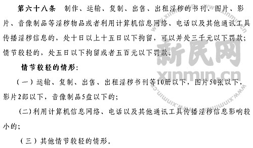 根據(jù)該局今日公布的《標(biāo)準(zhǔn)》第六十八條之規(guī)定:制作、運(yùn)輸、復(fù)制、出售、出租淫穢的書(shū)刊、圖片、影片、音像制品等淫穢物品,或者利用計(jì)算機(jī)信息網(wǎng)絡(luò)、電話以及其他通訊工具傳播淫穢信息的,處十日以上十五日以下拘留,可以并處三千元以下罰款;情節(jié)較輕的,處五日以下拘留或者五百元以下罰款。其中并沒(méi)有媒體所說(shuō)的“3次”限制。