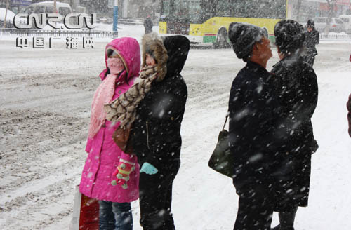行人冒著頂著風(fēng)雪等車