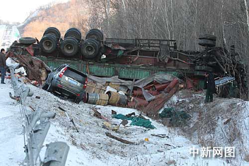 事故現(xiàn)場,一輛大貨車輪子超天側翻在路邊的深溝中,駕駛室嚴重扭曲變形,車上3人被困,路基下還有一輛長城吉普車,但該車體并沒有大礙,只是車內人員輕微受傷。在此高速公路段,由于這輛事故大貨車滑入路邊的溝中,后面的多輛車見狀立即采取緊急制動剎車,一輛載滿一車乘客的麒麟集團的大客車從下坡發(fā)現(xiàn)就開始制動,由于路面濕滑,大客車失控在路中來回擺動最終滑出200米橫在路中,車內乘客虛驚一場,所幸車內并沒有乘客受傷,這時另一輛大貨車從上坡下來看見大客車橫在路中,司機也立即采取制動,將車撞向路中的隔離護欄,避免了一起重特大事故發(fā)生,在該貨車的后面100米,還有兩輛轎車不程度受損。