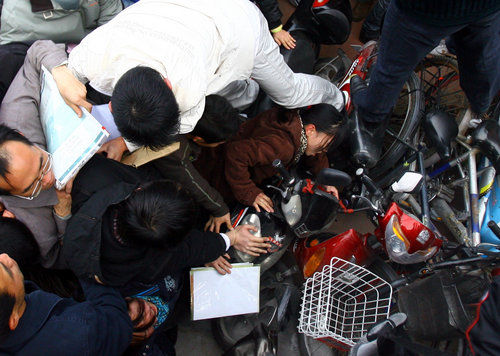 為防止意外發(fā)生,工作人員爬上門(mén)口的桌子,拿著擴(kuò)音喇叭一遍遍地提醒應(yīng)聘者不要再擁擠。省人才交流中心緊急組織20多名工作人員及保安趕到北門(mén)口處維持秩序。不少女生實(shí)在擠不到跟前,只好往后撤退,稱(chēng)“明天人少了再來(lái)”。
