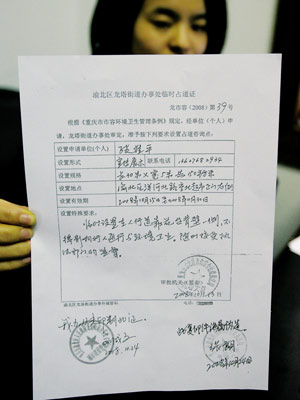 昨天下午,記者在觀音橋街道辦看到了張出示的那張《占道證》,全稱是龍市容(2008)第39號《渝北區(qū)龍塔街道辦事處臨時占道證》,印章蓋的是“渝北區(qū)市政綜合行政執(zhí)法局龍塔大隊”,發(fā)證時間為2008年10月13日。
