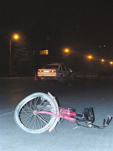 23時(shí)45分左右記者趕到事發(fā)現(xiàn)場時(shí),幾名交警正在勘查現(xiàn)場;椟S的路燈下,公路中間躺著遇難者;幾米遠(yuǎn)處,是那輛輪胎已經(jīng)變形的自行車;距自行車10米遠(yuǎn)的地方,停著一輛右側(cè)前燈處有嚴(yán)重“撞傷”痕跡的警用普通桑塔納轎車,警車車牌為“川Z0189警”。
