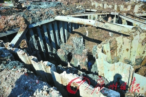 隨后,記者走近樁基大坑邊沿查看,只見(jiàn)大坑深約5米左右,坑內(nèi)已造好12根橋墩支撐柱,而坑壁都是由鋼鋁墻負(fù)責(zé)擋土,但地陷造成鋼鋁墻的一處出現(xiàn)裂口,大量泥土注入坑內(nèi),而鋼鋁墻的其他幾面也出現(xiàn)不同程度的多處扭曲。期間,有泥土不時(shí)滑入大坑內(nèi)。