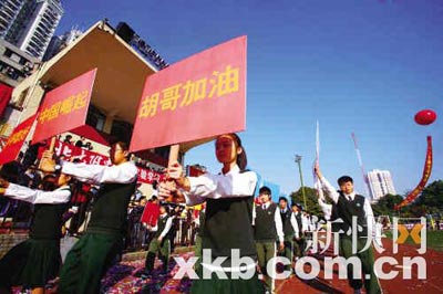 穿著統(tǒng)一服裝的學(xué)生高舉著“小平您好”、“中國崛起”、“胡哥加油”的標(biāo)語接受檢閱。昨天上午,北大附中廣州實驗學(xué)校第六屆體育節(jié)的開幕儀式基本上變成了“改革開放三十年”成果展。