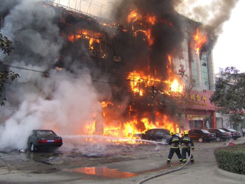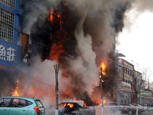 下午四點(diǎn),記者從中銀大道鑫源福瑞特超市出來(lái),發(fā)現(xiàn)北方有大量煙霧,順煙霧而去,在建設(shè)路口與消防車(chē)相遇,共同趕往事發(fā)地點(diǎn)。中銀大道已經(jīng)圍滿了人群,著火的商店火勢(shì)猛烈,被燒碎的玻璃啪啪直往下掉,門(mén)前的汽車(chē)也著了,一輛為晉M89550的紅旗轎車(chē)已經(jīng)燒的面目全非了。