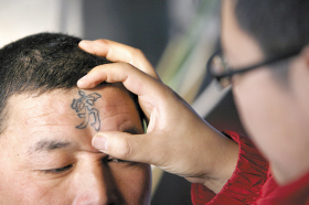 文在哪呢?他想也沒想,指向了腦門。過了30分鐘,一個(gè)鏤空的、深藍(lán)色的“窮”字就出現(xiàn)他的腦門上了,這個(gè)字花了他30元錢。