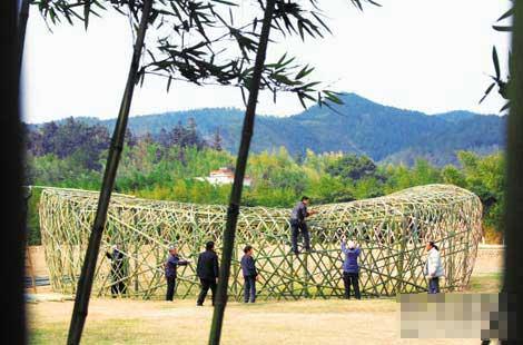 杭州雙溪景區(qū)的村民仿照奧運(yùn)鳥巢的造型,用了800根竹子,10多個(gè)人經(jīng)過15天的手工編制,以20比1的比例制作出“竹鳥巢”,并將它作為當(dāng)?shù)剜l(xiāng)村運(yùn)動(dòng)會(huì)的會(huì)場(chǎng),開展沙灘排球、弓箭狩獵、滾鐵圈等項(xiàng)目。(7月29日《天府早報(bào)》)