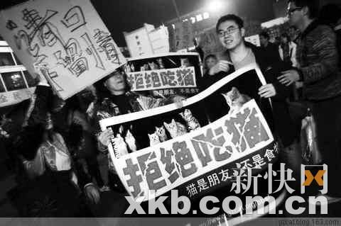 在廣場上,一見“聞貓即興”等人出來了,其他人都著急地圍上去詢問。盡管結(jié)果不是太讓人滿意,但大伙還是決定在廣場上舉行一次小型的抗議活動。100多人圍在一起,高舉著“請發(fā)揚人道主義,放過它們”、“請口下留情”、“拒吃貓肉”等紙牌,喊著口號。并有細(xì)心的網(wǎng)友拿著印制好的傳單,向候車的乘客宣傳“不吃貓肉”。對此,路人大都報以一笑。