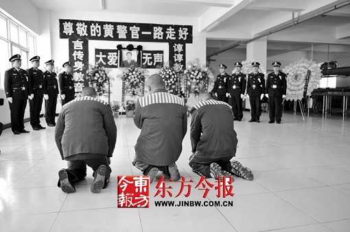 中午12時許,141名服刑人員一一向黃中文遺像鞠躬道別!包S指導,我們舍不得你走呀!蓖蝗,3名服刑人員“撲通”一聲,跪倒在黃中文遺像前,哭喊起來。監(jiān)獄長陳松介紹,這3人都是無期徒刑犯,在黃中文的關心和幫助下,他們3人積極改造,目前都減了刑期。