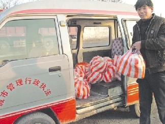 這輛昌河面包車兩扇車門上均噴有“城市管理行政執(zhí)法”字樣,車頭噴著“執(zhí)法”紅字,“法”字已脫落不清。民警打開車門,發(fā)現(xiàn)后排車座和前排副駕駛座上,堆放著一袋袋的蒸饃。