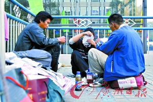 來自黑龍江的老頭其實不到50歲,雙手有殘疾。他和來自甘肅的小軍已經(jīng)“搭檔”了一年多,關(guān)系最好。聽老頭說,還在北京時,小軍當保安,他燒鍋爐,兩人就冒充過便衣警察和嫖客,到酒吧里抓小姐,“弄”到了好幾個包。后來活做膩了,兩人開始流浪,結(jié)伴南下。從北京到廣州,一路風餐露宿,足足走了半年才到。最后選定了人民北天橋這個據(jù)點。