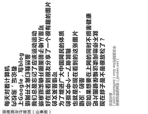 網(wǎng)上的“山寨版頸椎病治療秘笈”雖然版本眾多,但打開看看,其實(shí)都是“躺倒”的文字隔行穿插排列,想全部讀下來,必須把頭左歪歪再右歪歪。版主們稱,就在這歪頭的過程中,不用離開椅子和電腦,不知不覺地就鍛煉了頸椎,預(yù)防了頸椎病的發(fā)生,“特別適合天天上網(wǎng)的朋友”。“山寨版頸椎病治療秘笈”的原理就是左右扭動(dòng)脖子,在左右運(yùn)動(dòng)中鍛煉頸椎。