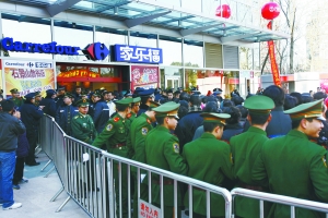 昨天上午10點左右,記者看到家樂福超市大門緊閉,門兩側(cè)各貼了一張解釋未能如期開張的告示。門前的圍欄里,一些工作人員正在向不斷趕到的顧客解釋關(guān)門原因。