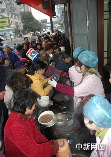 中新網(wǎng)杭州1月3日電(記者龔讀法 實(shí)習(xí)生金斌)2009年元月3日是農(nóng)歷臘月初八,這一天在中國民間有喝臘八粥的習(xí)俗,杭州人也同樣愛喝臘八粥。2009年的臘八,杭州的一些老字號(hào)藥館、寺廟以及社區(qū)一大早就開始免費(fèi)向市民派送臘八粥,喝上一碗熱騰騰的臘八粥,不但營養(yǎng)可口,還能祈求健康平安。